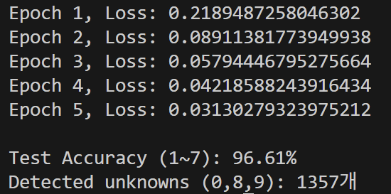 print(f"[0,8,9 unknown 정확도] : {100 * unknown_correct / unknown_total:.2f}% (총 {unknown_total}개 중 {unknown_correct}개)")