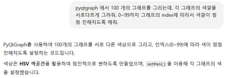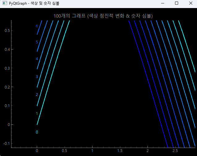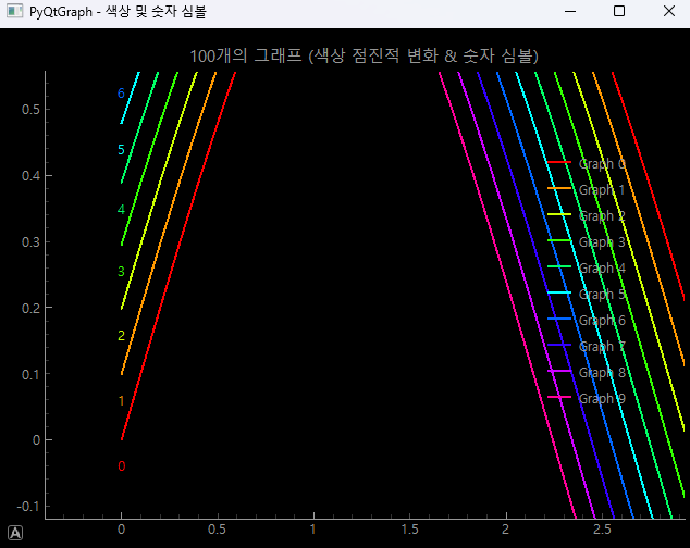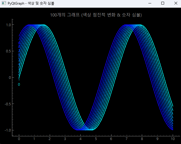 colors = [pg.intColor((50+(i/100)*205), hues=100) for i in range(num_plots)] # 색상 점진적 변화