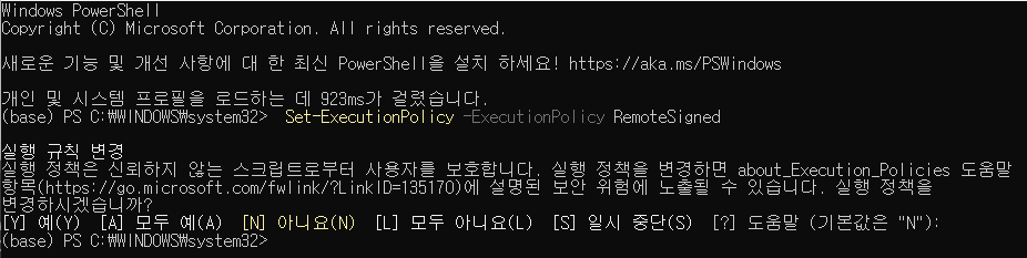 그러면 "실행 정책을 변경하시겠습니까?" 라고 나오는데, "A"를 입력하여 모두 예로 적용한다.