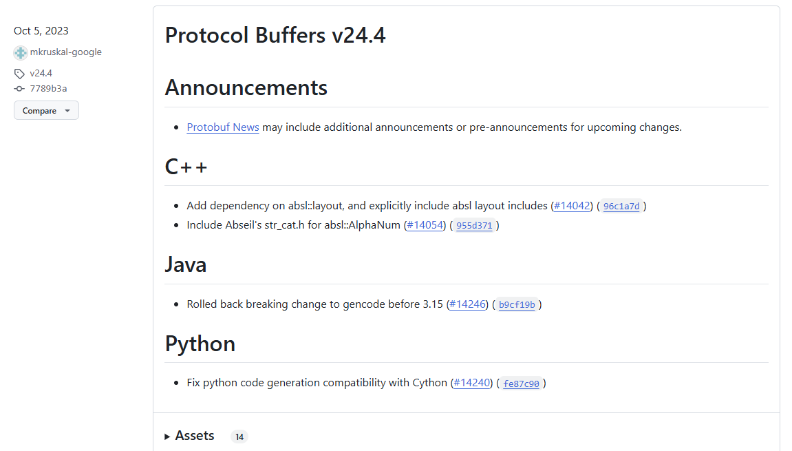 만약 환경이 python 3.7 이라면 기본적으로 protobuf library 4.24.4 버전이 설치된다. 이때는 protobuf compiler도 24.4 버전으로 맞춰서 다운받아야 한다.
