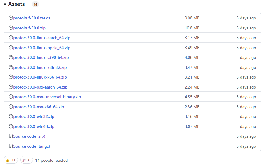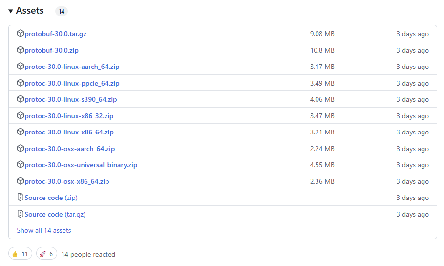아까 설치한 protobuf library의 버전이 30.0 이었다. 이 버전의 compiler를 다운 받으면 된다. v30.0 화면을 보면 Assets 라고 보인다. 거기서 자신의 OS에 맞는 버전을 다운받자. 여기서는 쉽게 하기 위해 window 버전을 다운 받자. 참고로 protobuf compiler 를 protoc 라고 한다. 그러므로 protoc-30.0 을 다운 받으면 된다.