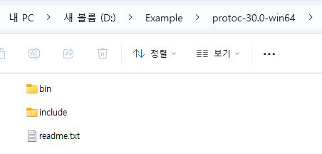 오케. protobuf compiler도 다운받았다. 압축파일을 풀면 아래와 같이 폴더가 있고 bin 폴더 밑에 protoc.exe 실행파일이 있는데, 이것이 protobuf compiler 이다.