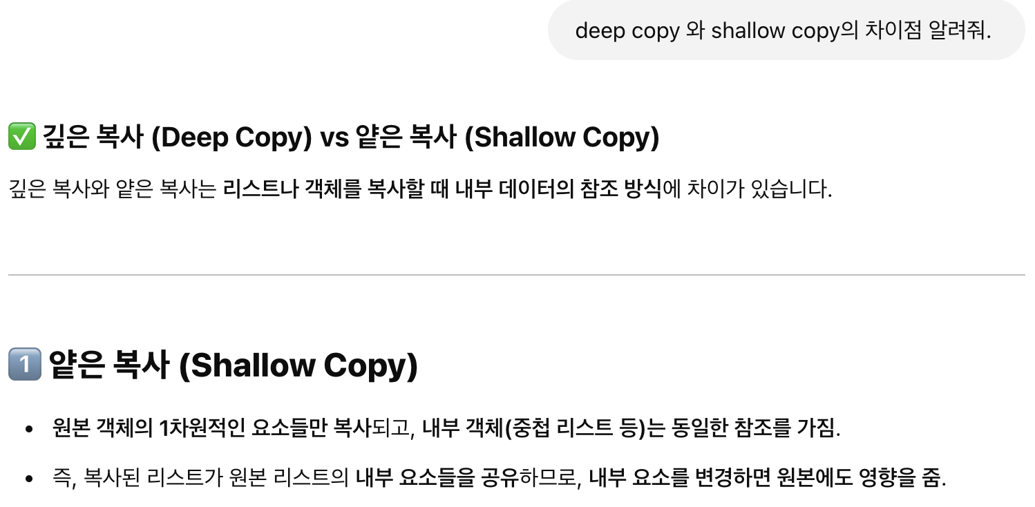 여기까지만 보면 깊은 복사(deep copy)와 얕은 복사(shallow copy)의 차이를 잘 모르겠다.