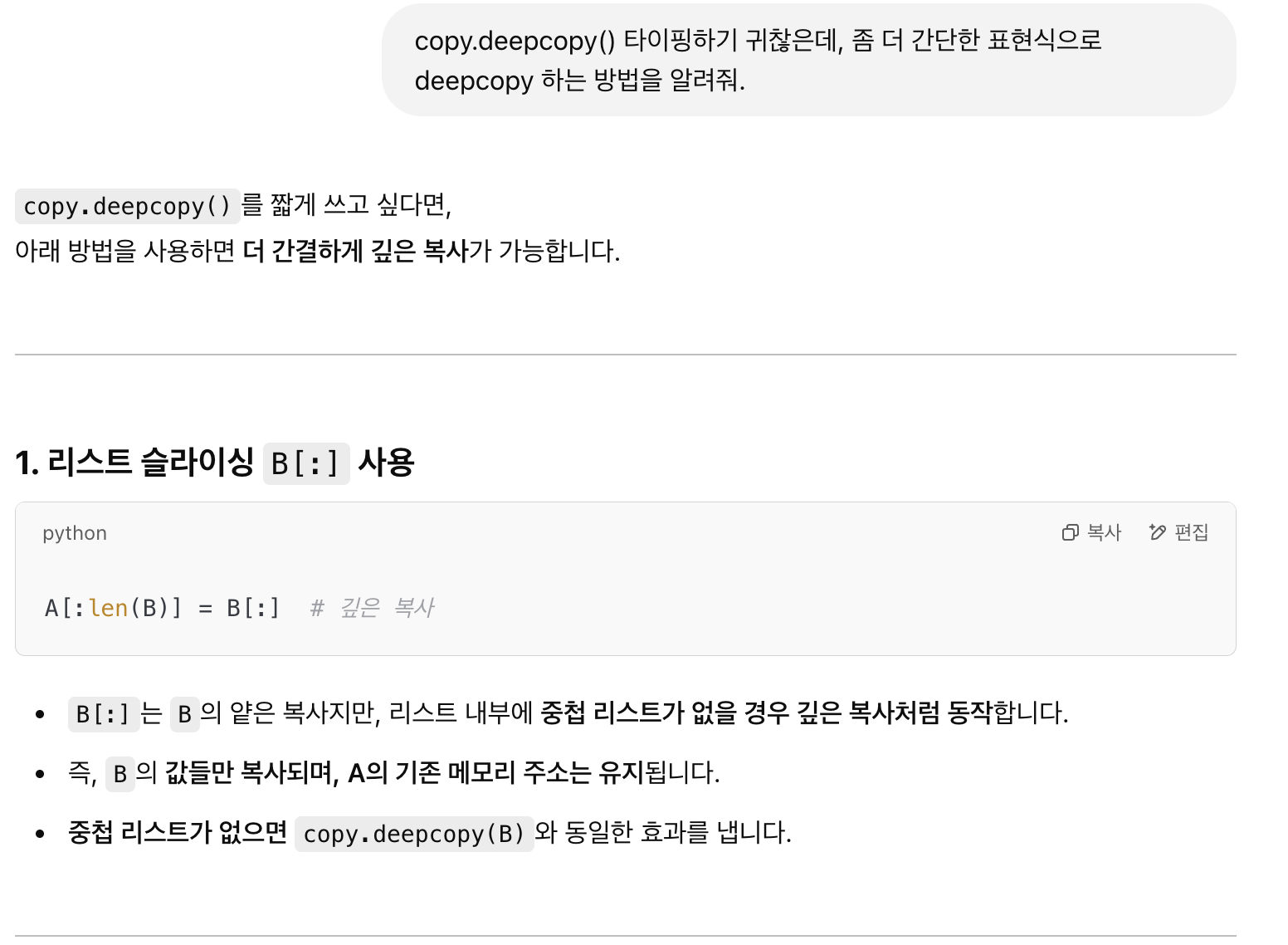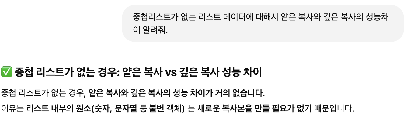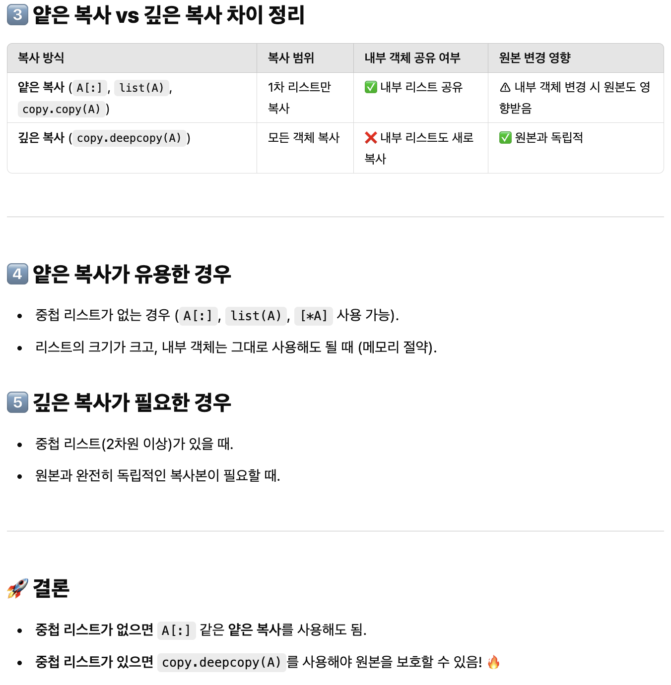 - 중첩리스트가 없으면 얕은 복사를 쓰는 것이 훨씬 성능이 빠르다.