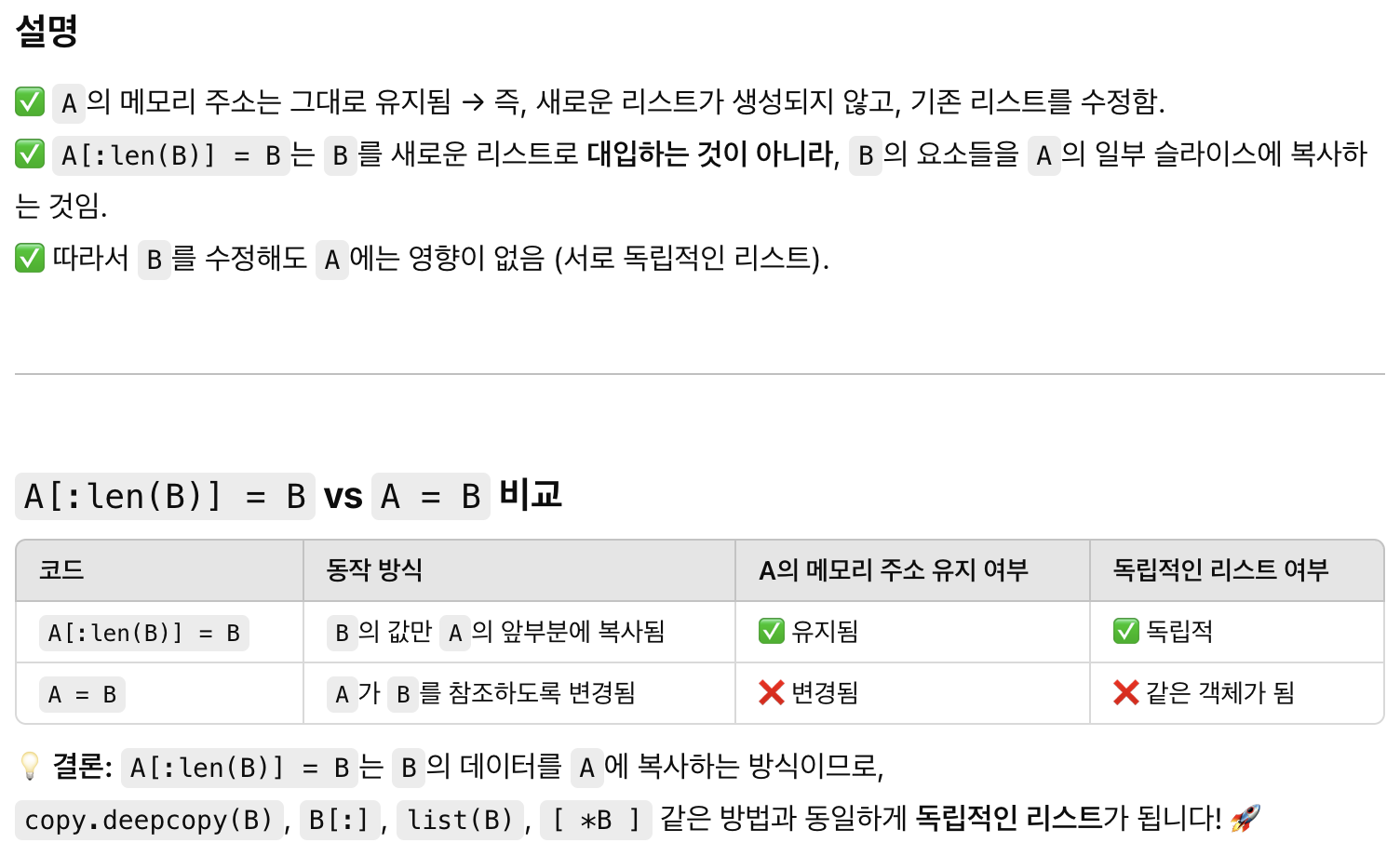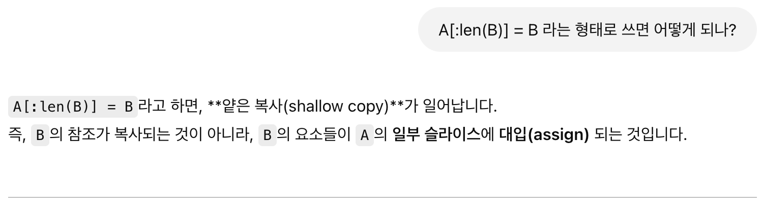 결론적으로로 말하면 A[:len(B)] = B 는 슬라이싱 방식과 동일하다고 한다.